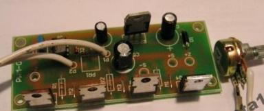 Obrázek regulátoru ze stavebnice zakoupené v GM Electronic za cca 20- Kč. Tranzistor v horním schematu je nahrazen MOS-FETem IRFZ44. Regulátor otáček PWM stejnosměrných motorů do 30A. Napájecí napětí - 24V , regulace - 1 šířkou pulzu - střídy. U asynchronního motoru , kde otáčky závisí na kmitočtu sítě se regulace tímto regulátorem nedá příliš použít, protože tyto motory nepříznivě reagují na deformaci sinusovky.